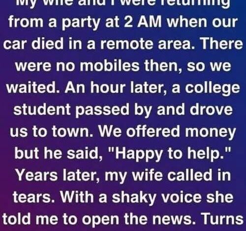 Then, without warning, headlights appeared in the distance. A small car pulled up behind us, and a young man stepped out calmly, offering help without hesitation. He didn’t ask for anything in return or question our situation—he simply focused on getting us back on the road. In a moment defined by fear and isolation, his quiet act of kindness shifted everything, turning a frightening experience into one we would never forget.